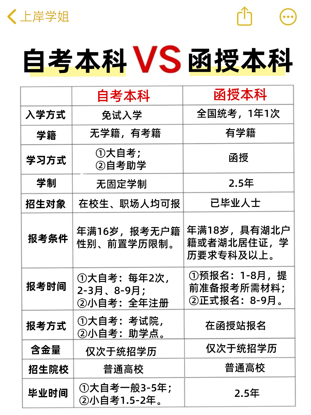 自考本科没有入学考试,随报随考,一年两次考试机会(4月和10月),所有科目合格后即可申请毕业。相比之下,函授本科需要通过入学考试才能正式入学,并完成2.5年学制的学习后,通过期末考试,才有资格申请毕业。